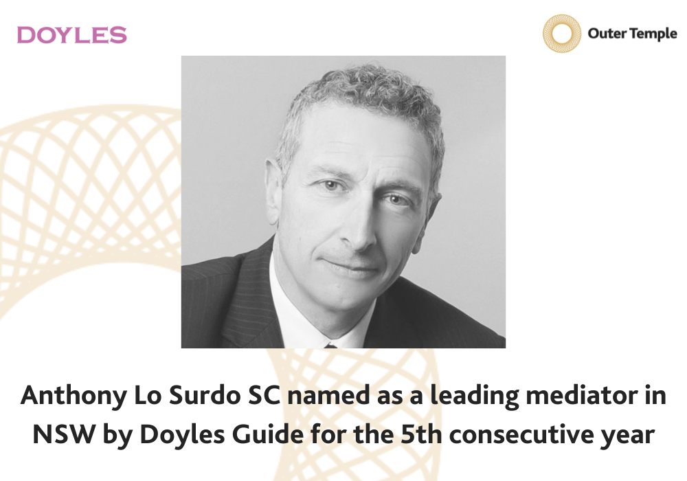 Anthony Lo Surdo SC has been recognised by Doyle’s Guide to the Australian Legal Profession as a leading mediator in New South Wales 2022. He has been so ranked for the last 5 consecutive years since the category was first introduced.
