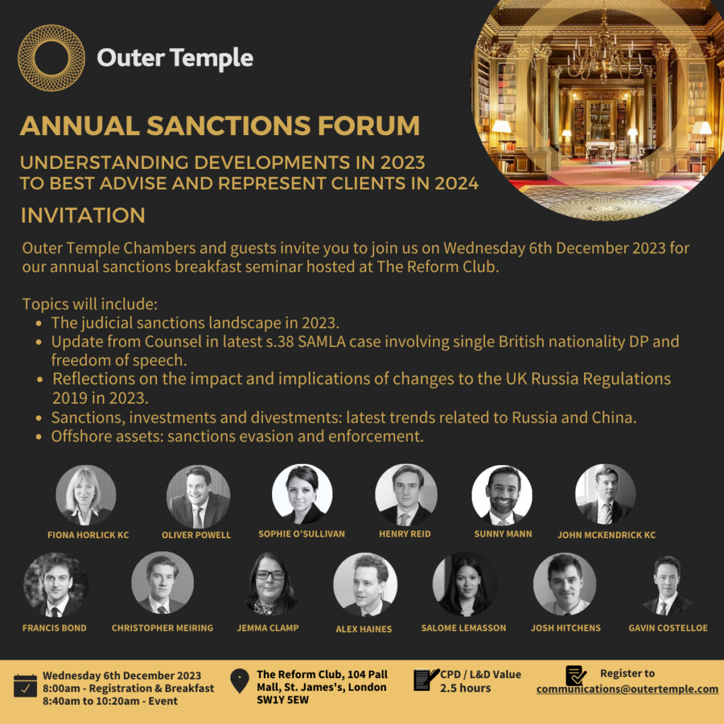 You are invited to join Outer Temple Chambers’ Sanctions Team, alongside other experts for our Annual Sanctions Forum 2023.