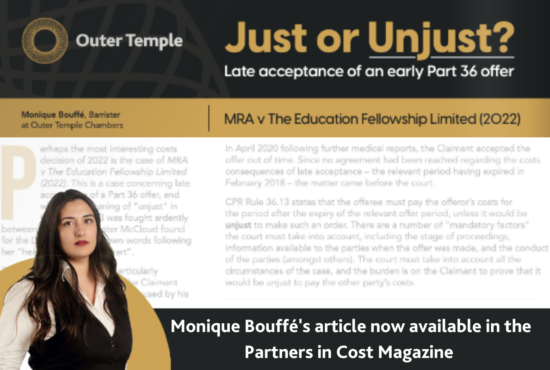 Outer Temples Monique Bouffé wrote an article on the late acceptance of a Part 36 offer and how this impacted the case of MRA v The Education Fellowship Limited (2022). Monique worked alongside James Counsell KC, also of Outer Temple, on this case for the claimant. The magazine was distributed at the AvMA Annual Clinical Negligence Conference in March 2023, proudly sponsored by Outer Temple Chambers. The event, attended by clinical negligence specialists, provided an update on all the key issues, developments and policies in the clinical negligence and medical law. Monique’s article looks at perhaps the most interesting costs decision of 2022 in the case of MRA v The Education Fellowship Limited (2022), concerning late acceptance of a part…
